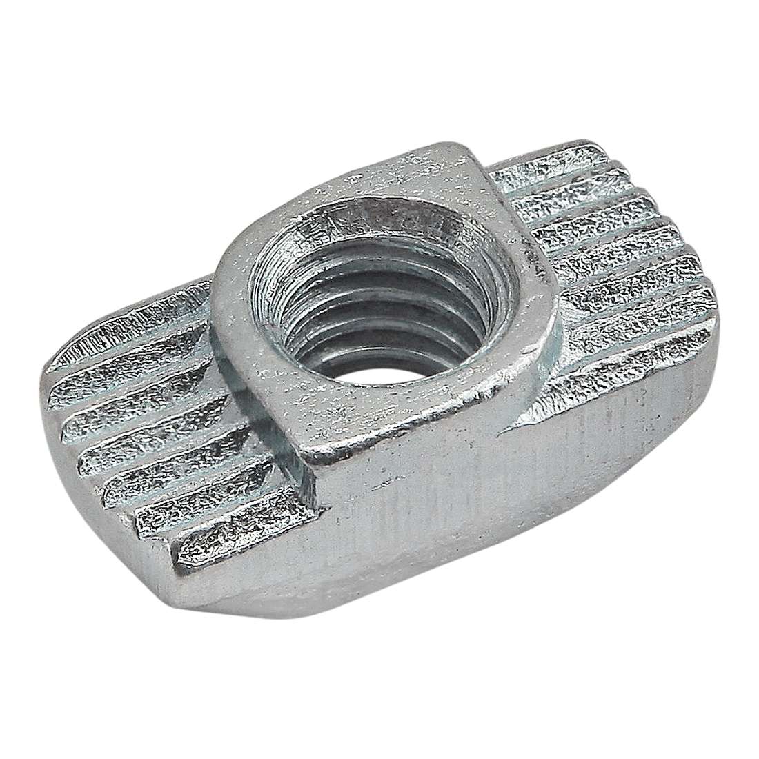 The standard drop-in T-nut is a fastening option that loads either from the profile ends or side, which is helpful for applications where the ends are inaccessible. It has ridges that bite into the profile surface, creating a strong connection. The standard drop-in T-nut is available with options in size, material, thread, and finish.