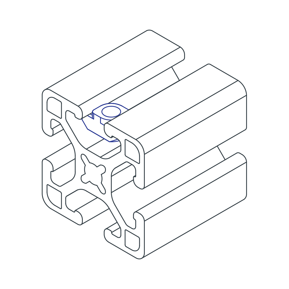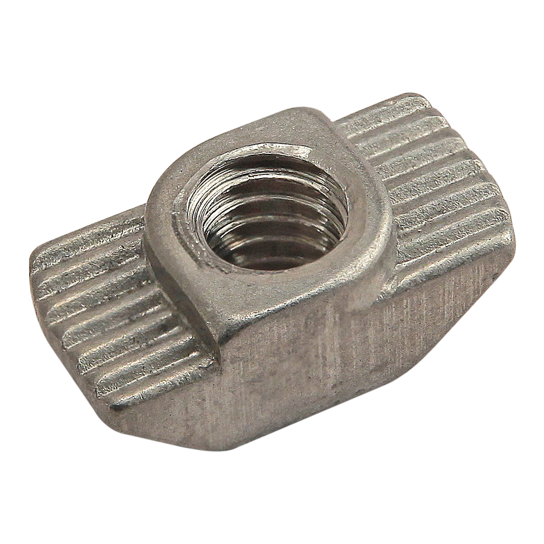 The standard drop-in T-nut is a fastening option that loads either from the profile ends or side, which is helpful for applications where the ends are inaccessible. It has ridges that bite into the profile surface, creating a strong connection. The standard drop-in T-nut is available with options in size, material, thread, and finish.