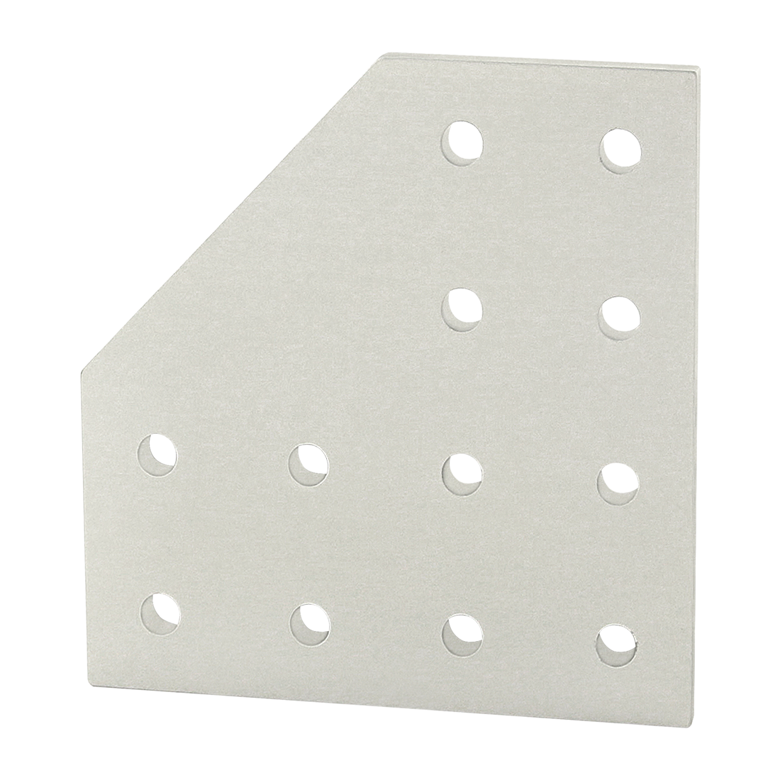 The 12 hole – 90 degree angled flat plate is an external fastening method that requires no machining services. This flat plate creates a 90-degree angle between profiles and its shape reinforces the strength of the connection. It is a durable option that is easy to assemble and can be reconfigured and reused. The suggested mounting hardware can be found on the “Suggested Hardware” tab. Tip: Use double or triple slide-in economy T-nuts to save time and money. Pre-load your hardware prior to connecting profiles to simplify your assembly.