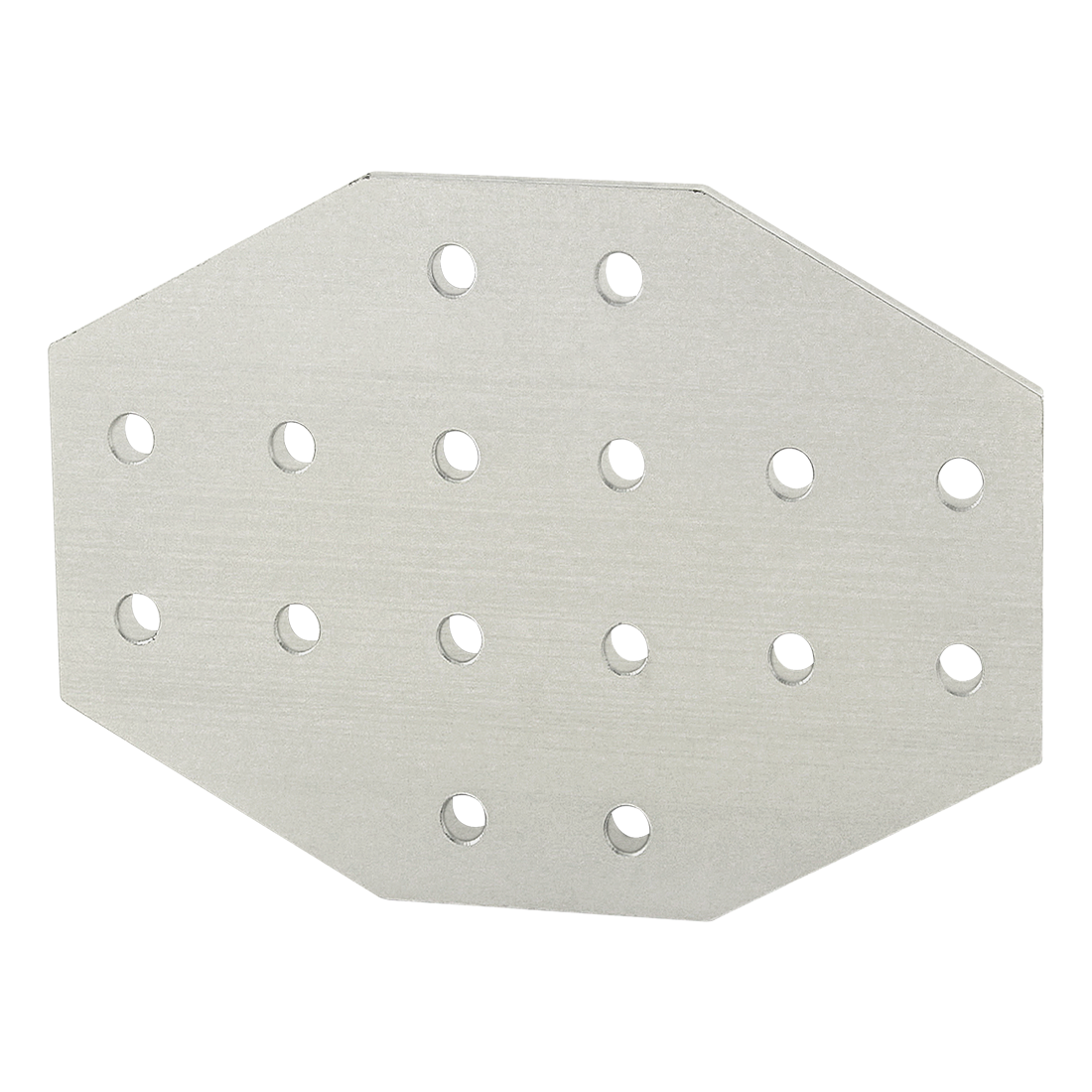 The 16 hole – cross flat plate is an external fastening method that can be used to join more than two profiles or even create a 4-way connection hub. It provides a strong, long-lasting connection that is easy to assemble and requires no machining services. The 16 hole – cross flat plate is durable and can be repositioned and reused. The suggested mounting hardware can be found on the “Suggested Hardware” tab. Tip: Use double or triple slide-in economy T-nuts to save time and money. Pre-load your hardware prior to connecting profiles to simplify your assembly.