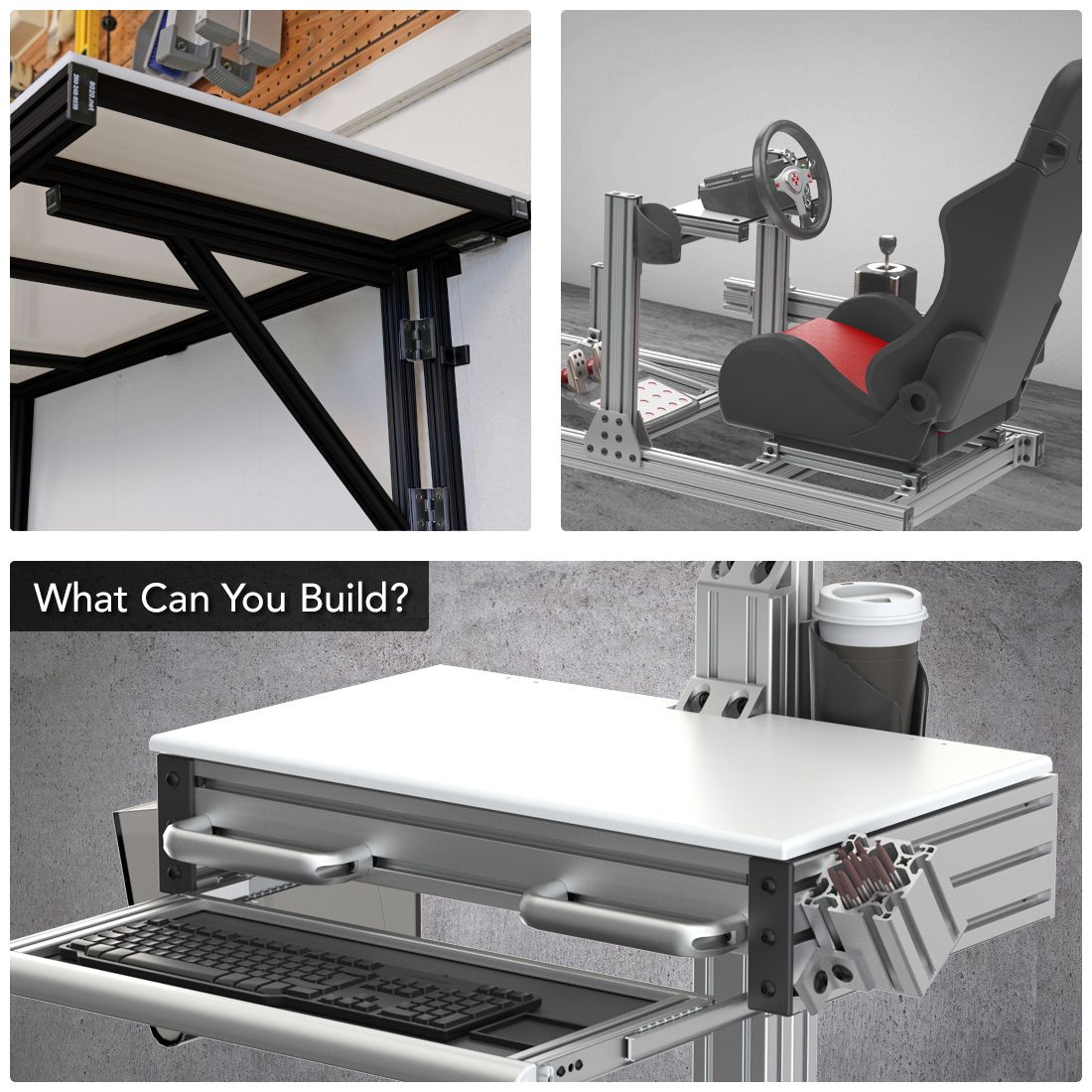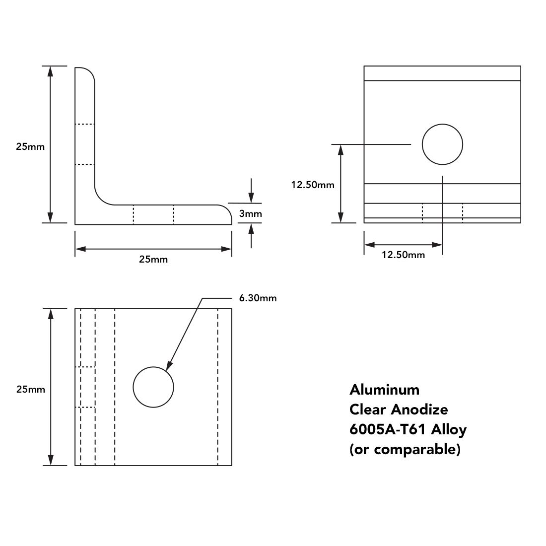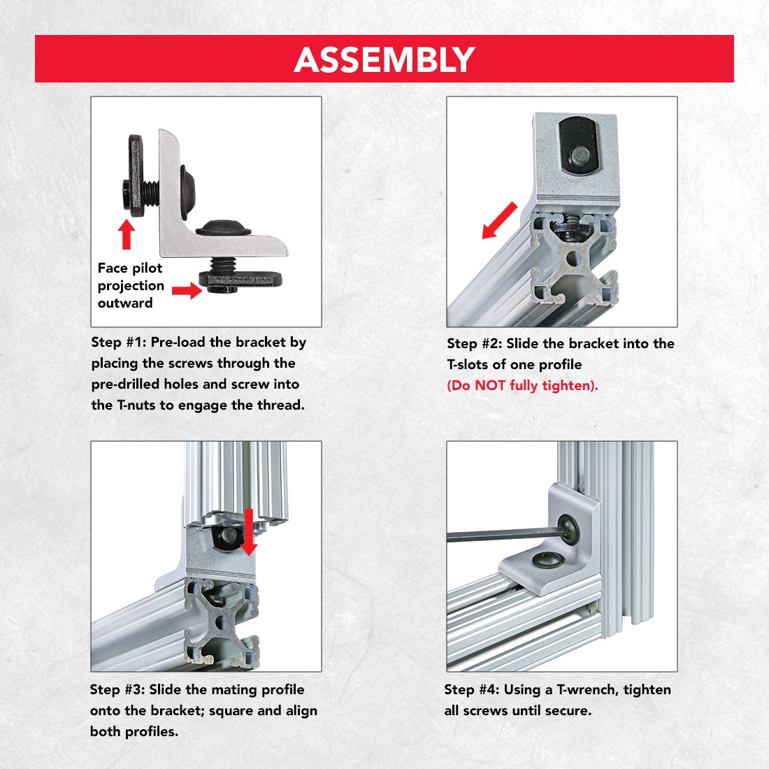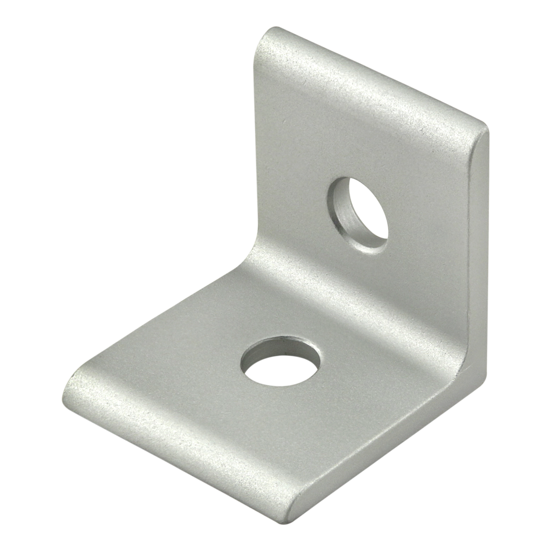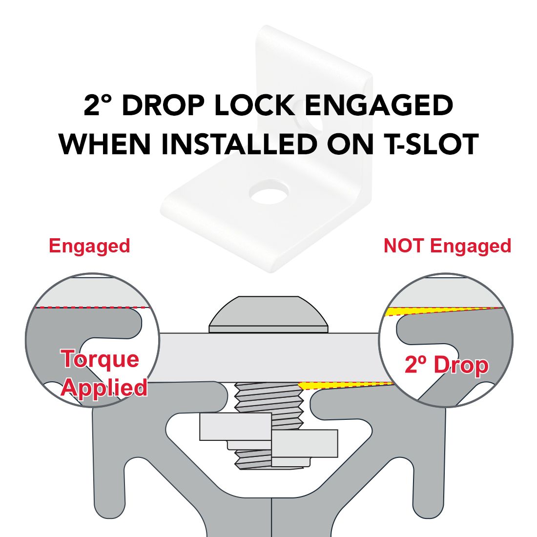 The 2 hole – lite inside corner bracket is an external fastening method that creates a 90 degree connection. It is a lightweight bracket that requires no machining services and can provide infinite positioning along the profile T-slot, allowing a large degree of adjustability. The 2 hole – lite inside corner bracket engages the 2-degree drop-lock feature when the assembly bolts are tightened to the required torque. It is a fastening method that can be repositioned and reused. The suggested mounting hardware can be found on the “Suggested Hardware” tab.