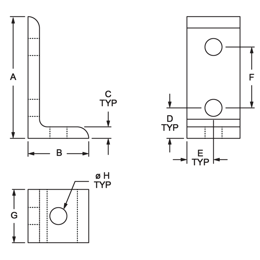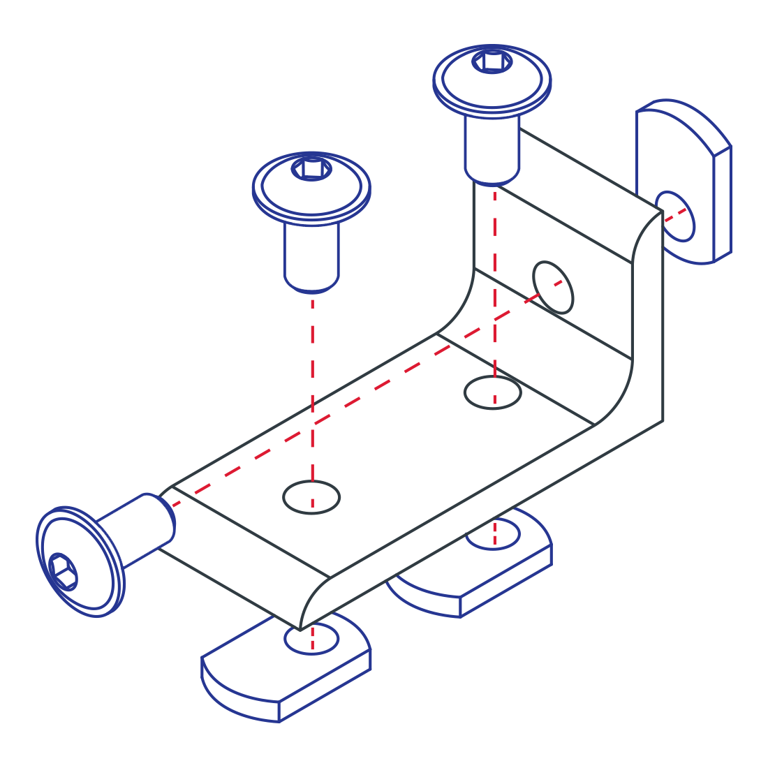 The 3 hole – inside corner bracket is an external fastening method that creates a 90 degree connection. There are two stacked holes on one side and one hole on the opposite side of the bracket. This fastener requires no machining services and can provide infinite positioning along the profile T-slot, allowing a large degree of adjustability. The 3 hole – inside corner bracket engages the 2-degree drop-lock feature when the assembly bolts are tightened to the required torque. It is a fastening method that can be repositioned and reused. The suggested mounting hardware can be found on the “Suggested Hardware” tab.