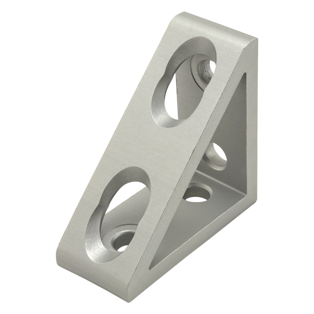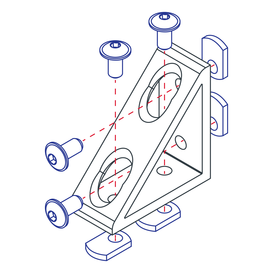 The 4 hole – tall gusseted inside corner bracket is a strong, external fastening method that creates a 90 degree connection. Each side of the bracket has two holes stacked one on top of the other. It requires no machining services and can provide infinite positioning along the profile T-slot, allowing a large degree of adjustability. The shape of the gusset provides extra material, strengthening the connection. The 4 hole – tall gusseted inside corner bracket engages the 2-degree drop-lock feature when the assembly bolts are tightened to the required torque. It is a fastening method that can be repositioned and reused. The suggested mounting hardware can be found on the “Suggested Hardware” tab.