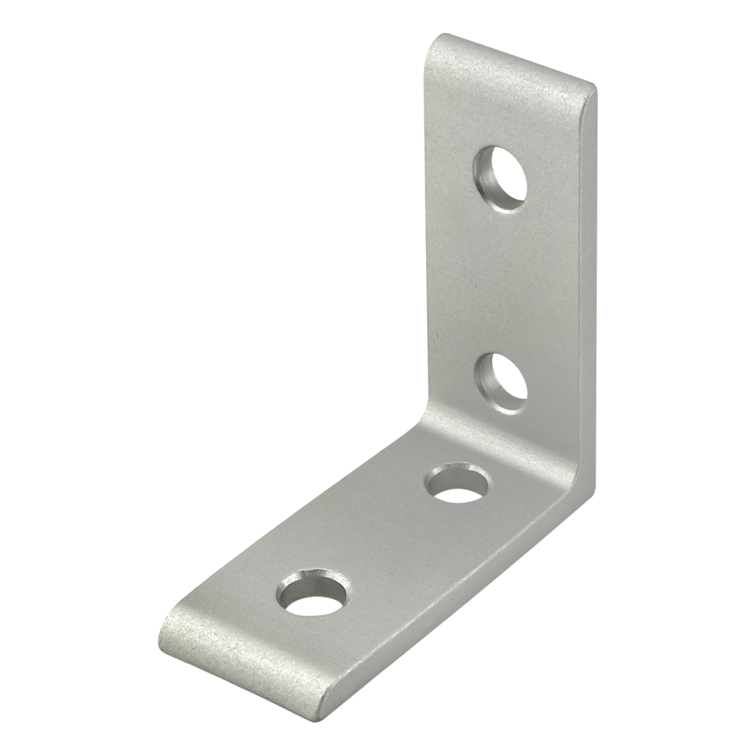 The 4 hole – tall inside corner bracket is an external fastening method that creates a 90 degree connection. Each side of the bracket has two holes stacked one on top of the other. This fastener requires no machining services and can provide infinite positioning along the profile T-slot, allowing a large degree of adjustability. The 4 hole – tall inside corner bracket engages the 2-degree drop-lock feature when the assembly bolts are tightened to the required torque. It is a fastening method that can be repositioned and reused. The suggested mounting hardware can be found on the “Suggested Hardware” tab.