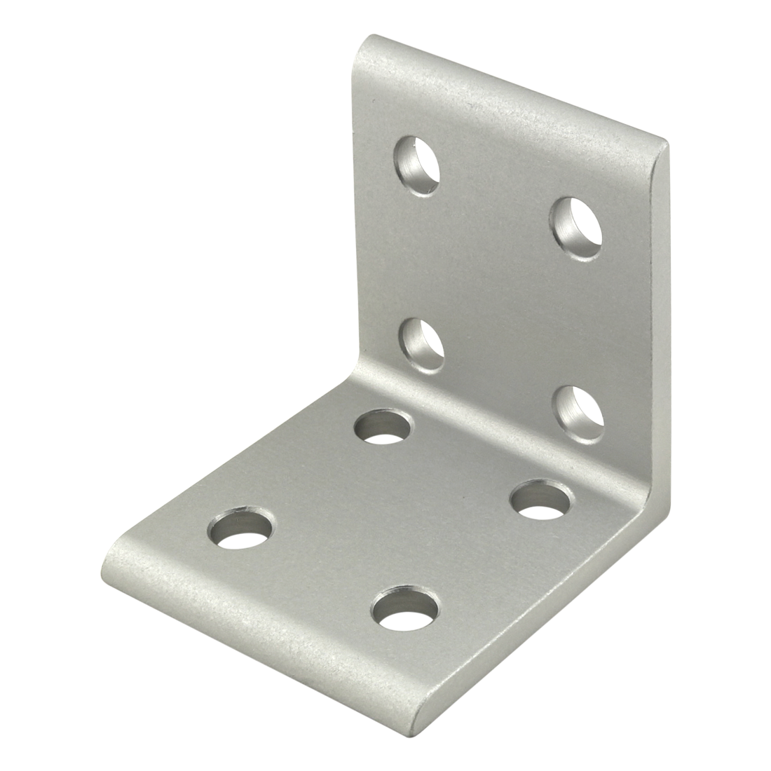 The 8 hole – inside corner bracket is an external fastening method that creates a 90 degree connection and has four holes on each side of the bracket, comprised of two rows and two columns. It requires no machining services and can provide infinite positioning along the profile T-slot, allowing a large degree of adjustability. The 8 hole – inside corner bracket engages the 2-degree drop-lock feature when the assembly bolts are tightened to the required torque. It is a fastening method that can be repositioned and reused. The suggested mounting hardware can be found on the “Suggested Hardware” tab.