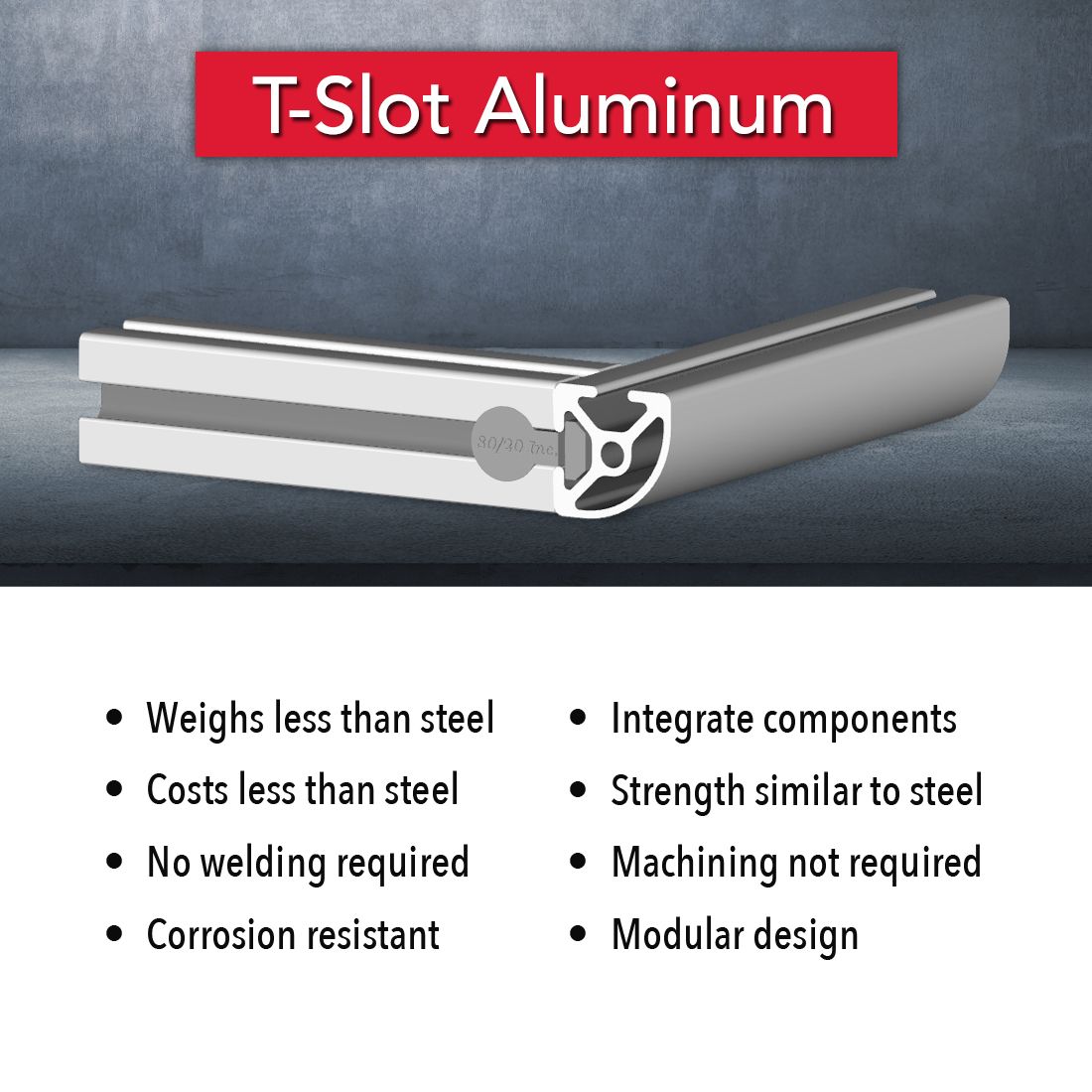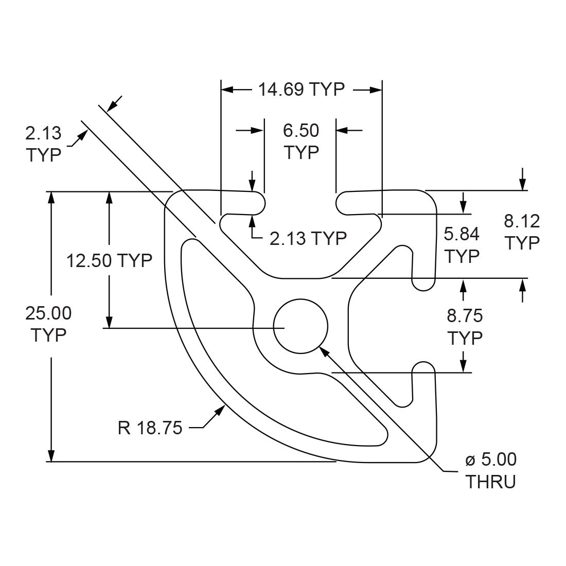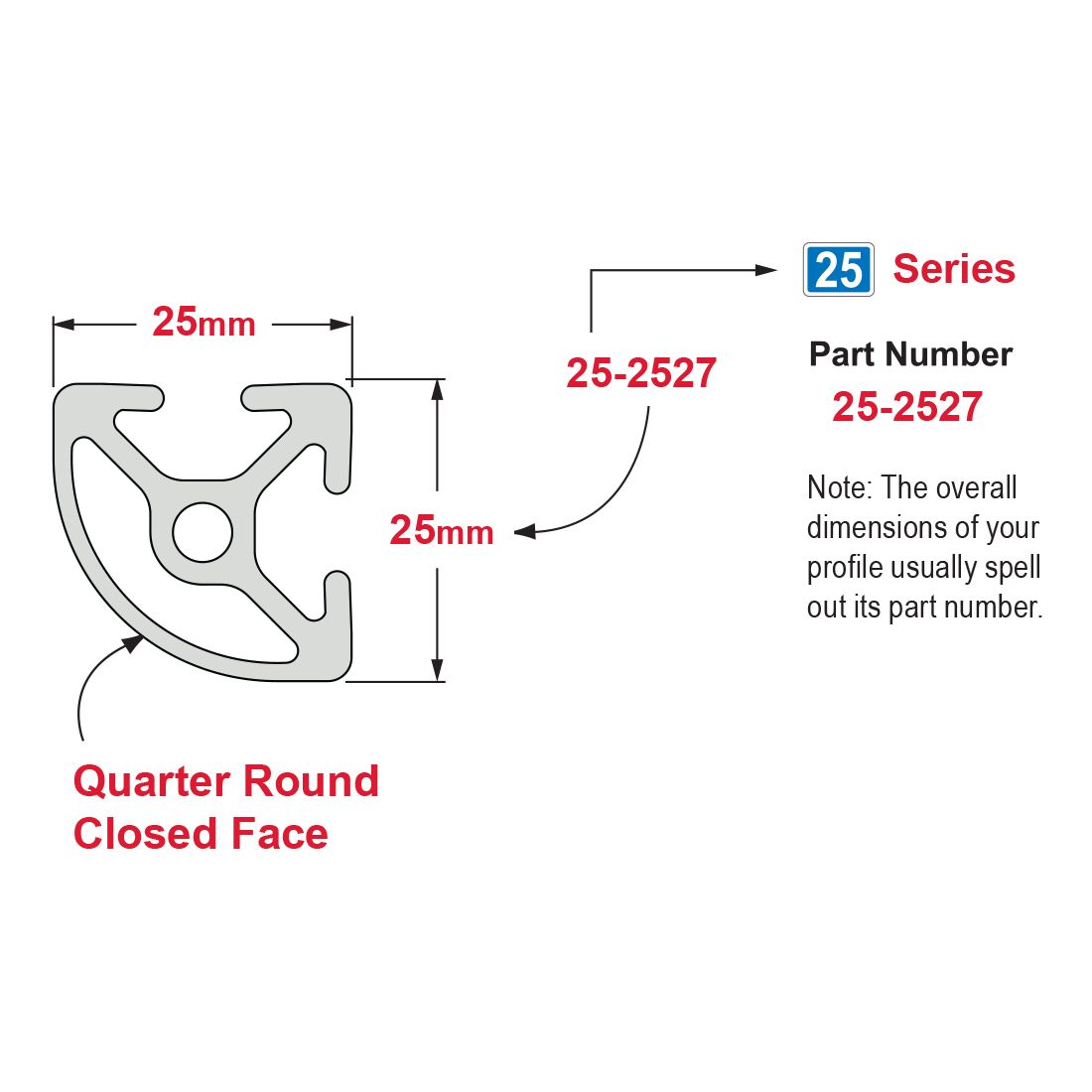 25-2527 is a 25mm x 25mm metric 25 series quarter round T-slot profile with an 18.75mm radius curved back and two open T-slots, one on each of the 25mm profile faces. The profile is smooth, which makes it resistant to dirt and debris buildup while also being easy to clean. The 25-2527 profile is compatible with 25 series fasteners. This profile lends itself to workstations and displays because panels or other support structures can be easily placed in the T-slots allowing a continuous surface and aesthetic appearance.