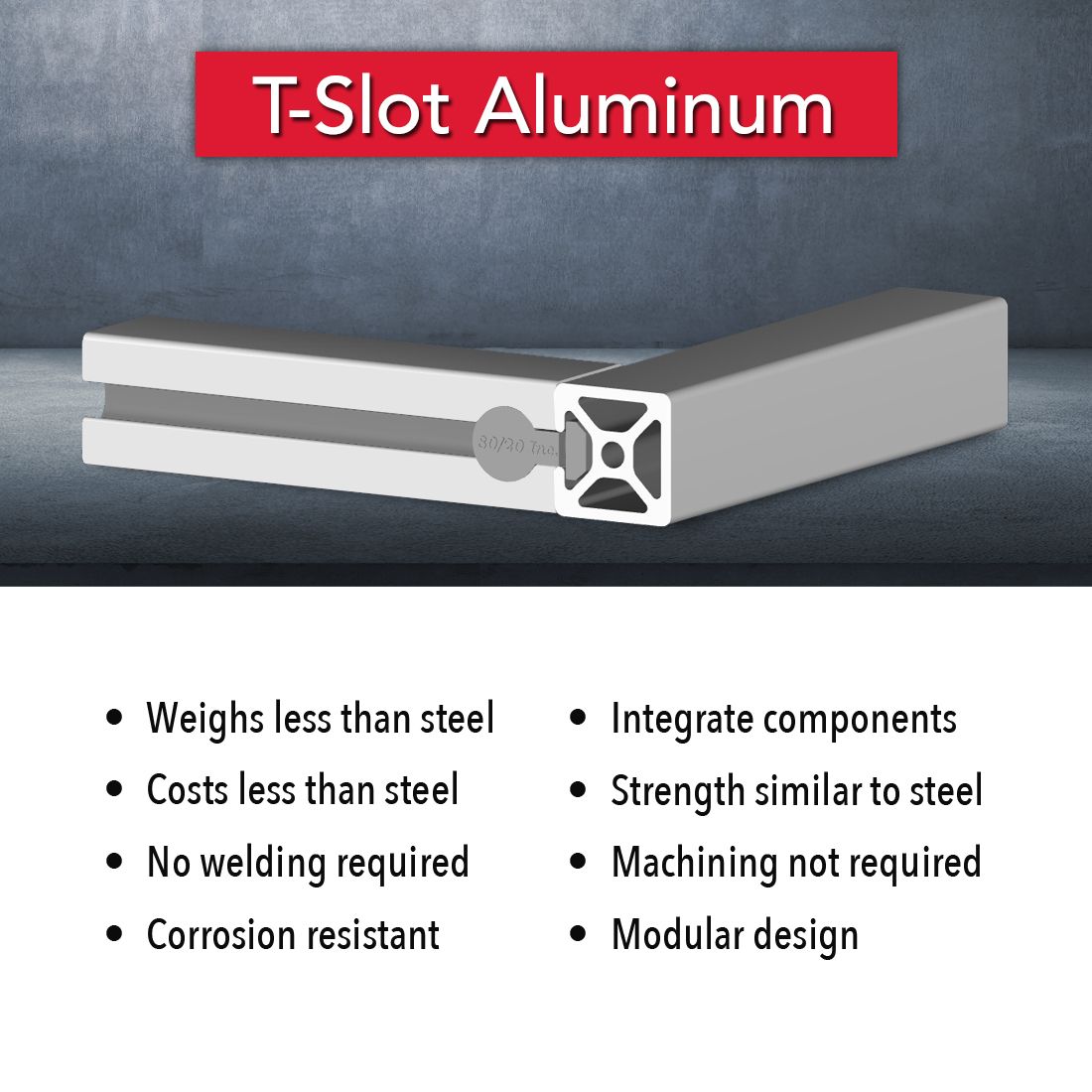 25-2501 is a 25mm x 25mm metric 25 series square T-slot profile with one open T-slot on one 25mm face. The profile is smooth, which makes it resistant to dirt and debris buildup while also being easy to clean. The 25-2501 profile is compatible with 25 series fasteners. The three closed faces on this profile provide a clean, aesthetic look and it lends itself to furniture, displays, desks, trade show booths, or retail kiosks.