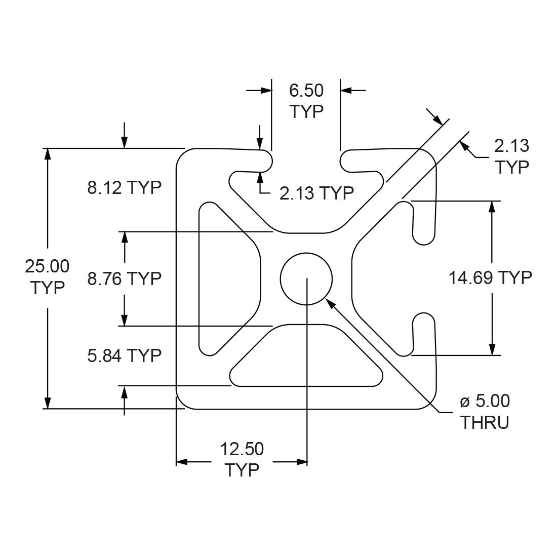 25-2502 is a 25mm x 25mm metric 25 series square T-slot profile with two adjacent open T-slots, one on two 25mm faces. The profile is smooth, which makes it resistant to dirt and debris buildup while also being easy to clean. The 25-2502 profile is compatible with 25 series fasteners. The two closed faces on this profile provide a clean, aesthetic look while also having the capability to mount additional profiles, parts and accessories. It lends itself to furniture, displays, desks, trade show booths, or retail kiosks.