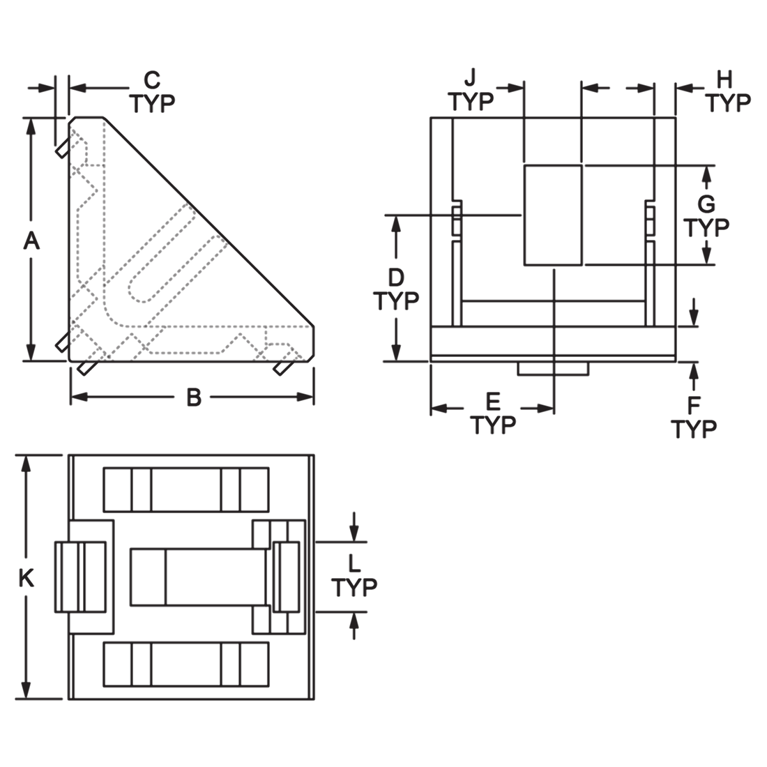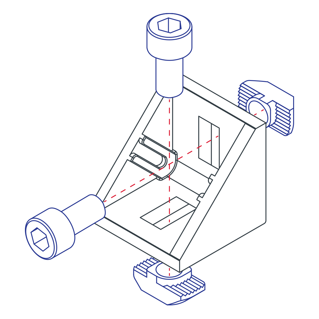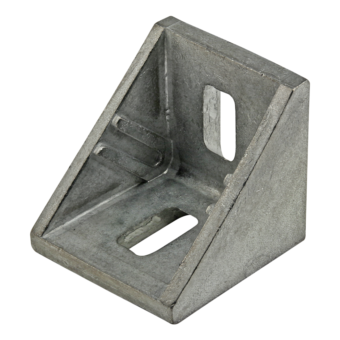 The 2 hole – 28mm slotted inside corner bracket with dual support is an external, die-cast fastening method that creates a 90 degree connection. The dual support provides additional strength while the slotted mounting holes allow for greater adjustability between the connecting profiles. Brackets with a slot tab on the support help to line up the profile with the bracket and prevent rotation. This fastener requires no machining services and can provide infinite positioning along the profile T-slot. The suggested mounting hardware can be found on the “Suggested Hardware” tab.