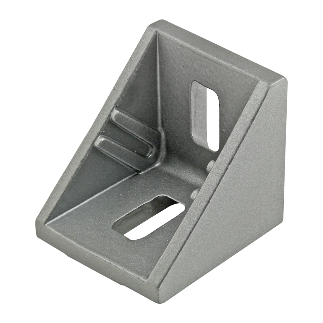 The 2 hole – 28mm slotted inside corner bracket with dual support is an external, die-cast fastening method that creates a 90 degree connection. The dual support provides additional strength while the slotted mounting holes allow for greater adjustability between the connecting profiles. Brackets with a slot tab on the support help to line up the profile with the bracket and prevent rotation. This fastener requires no machining services and can provide infinite positioning along the profile T-slot. The suggested mounting hardware can be found on the “Suggested Hardware” tab.