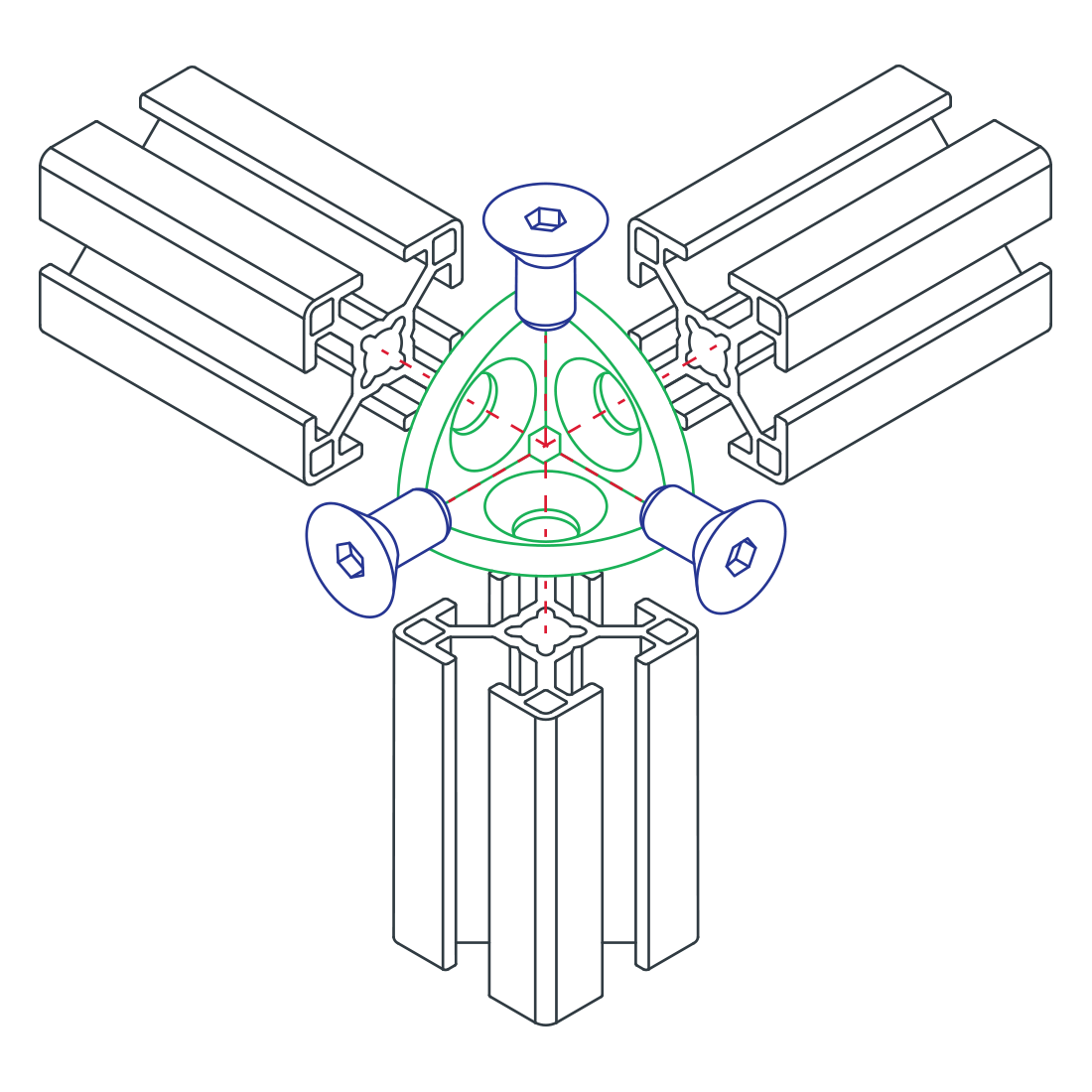 The 3 way – rounded corner bracket is a die-cast external fastening method that is typically used to create an outside corner connection between three profiles. It offers stability and can also be reused and repositioned. The simplicity of this bracket makes it easy to connect multiple profiles. The 3 way – rounded corner bracket requires an end tap machining service on each of the connecting profiles. The suggested hardware can be found on the “Suggested Hardware” tab.