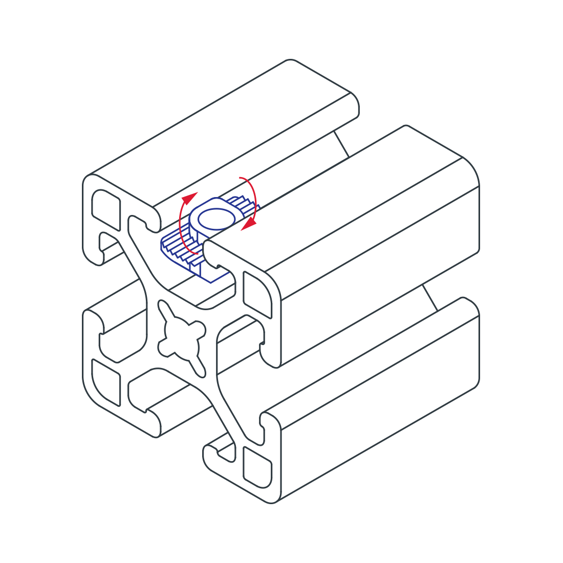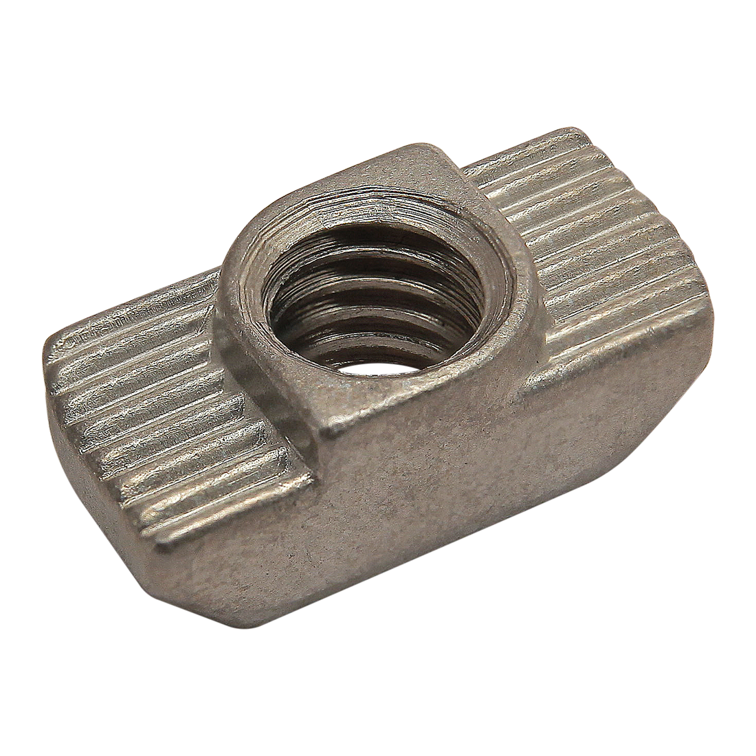 The standard drop-in T-nut is a fastening option that loads either from the profile ends or side, which is helpful for applications where the ends are inaccessible. It has ridges that bite into the profile surface, creating a strong connection. The standard drop-in T-nut is available with options in size, material, thread, and finish.