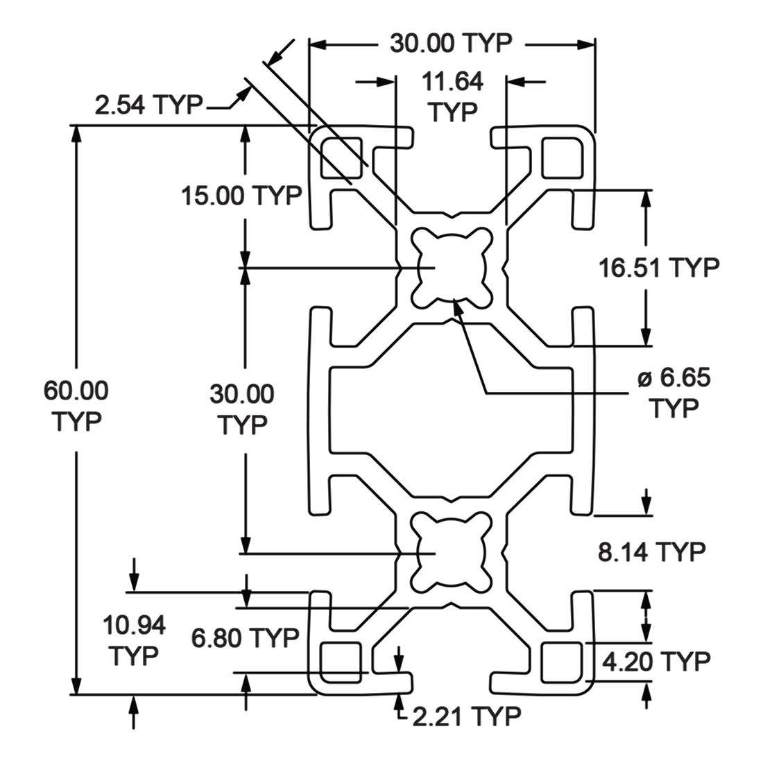 30mm X 60mm T-Slotted Profile – Six Open T-Slots