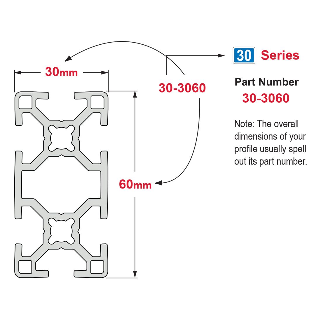 30-3060 is a 30mm x 60mm metric 30 series rectangular T-slot profile with six open T-slots, two on each 60mm face and one on each 30mm face. The profile is smooth, which makes it resistant to dirt and debris buildup while also being easy to clean. The 30-3060 profile is compatible with 30 series fasteners and lends itself to work spaces, machine guards and displays.