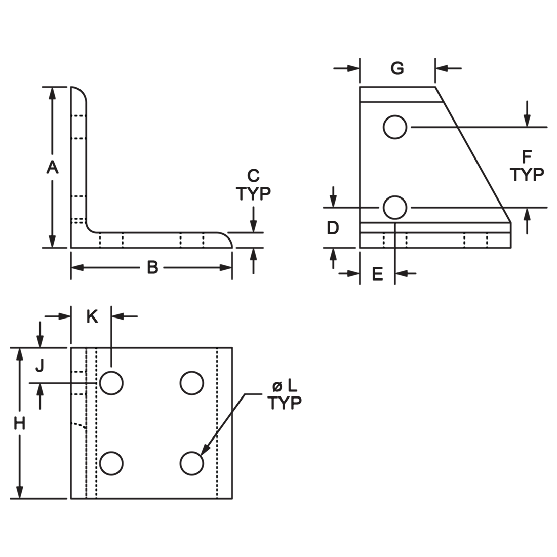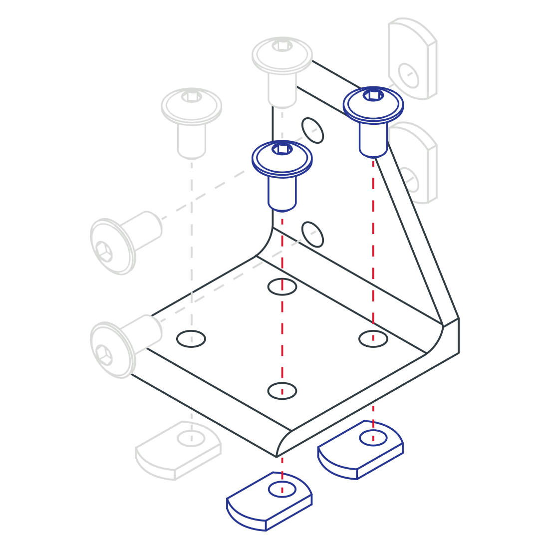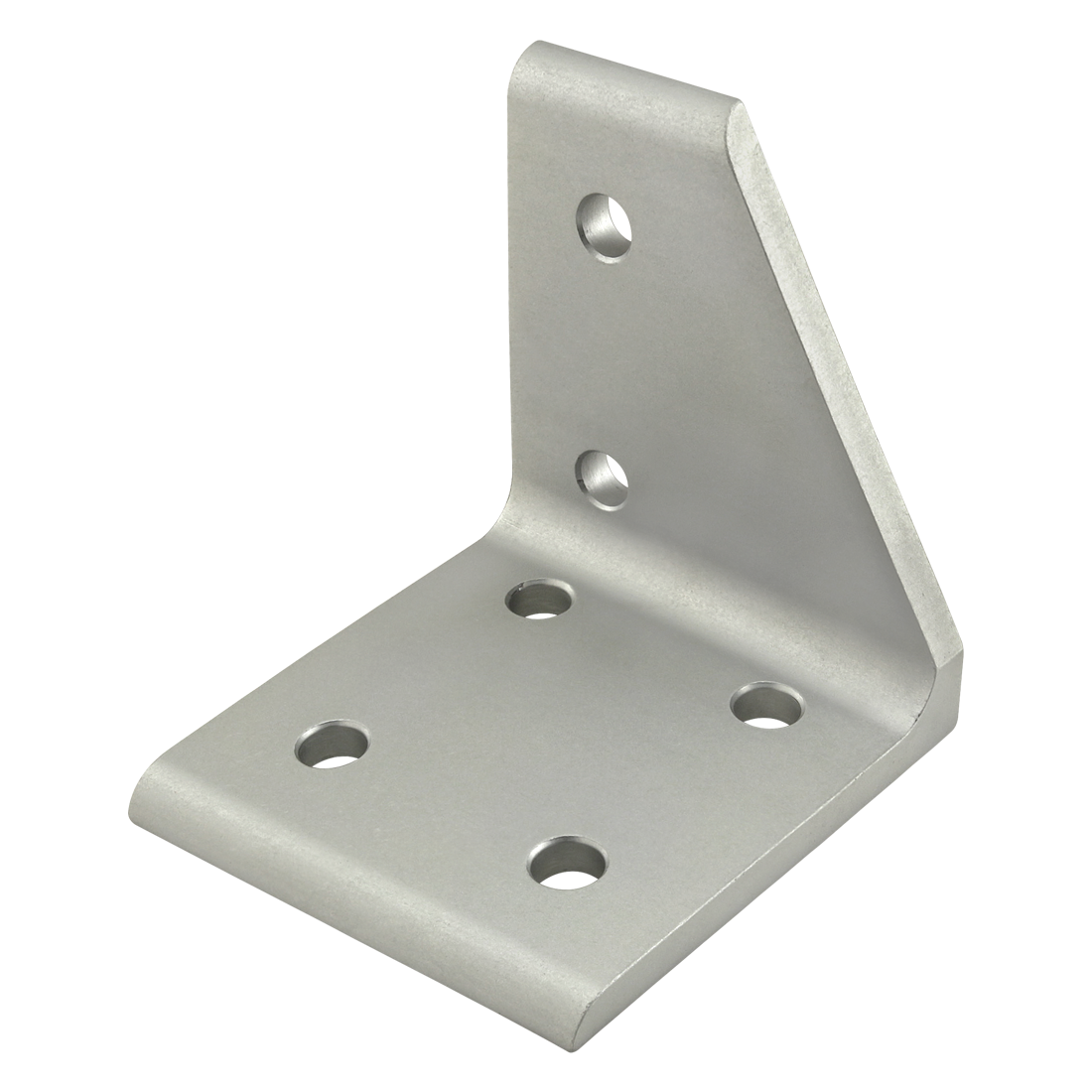 The 6 hole – left aligned inside corner bracket is an external fastening method that creates a 90 degree connection. One side of the bracket has four holes comprised of two rows and two columns while the second side has two left-aligned, stacked holes. This bracket can be used to connect profiles that are within the same series but of different sizes. It requires no machining services and can provide infinite positioning along the profile T-slot, allowing a large degree of adjustability. The 6 hole – left aligned inside corner bracket engages the 2-degree drop-lock feature when the assembly bolts are tightened to the required torque. It is a fastening method that can be repositioned and reused. The suggested mounting hardware can be found on the “Suggested Hardware” tab.