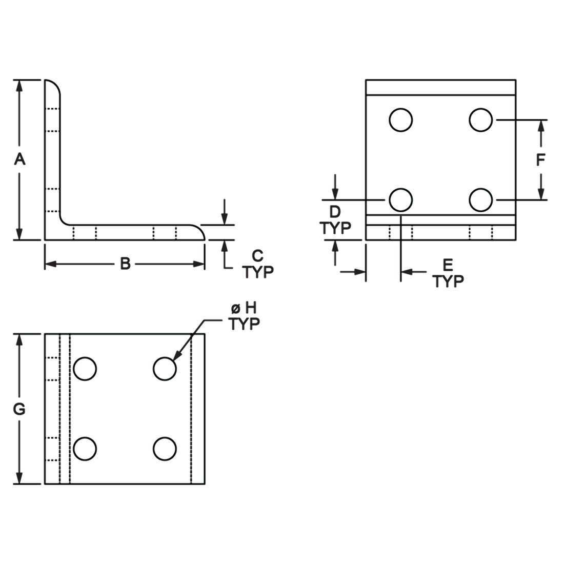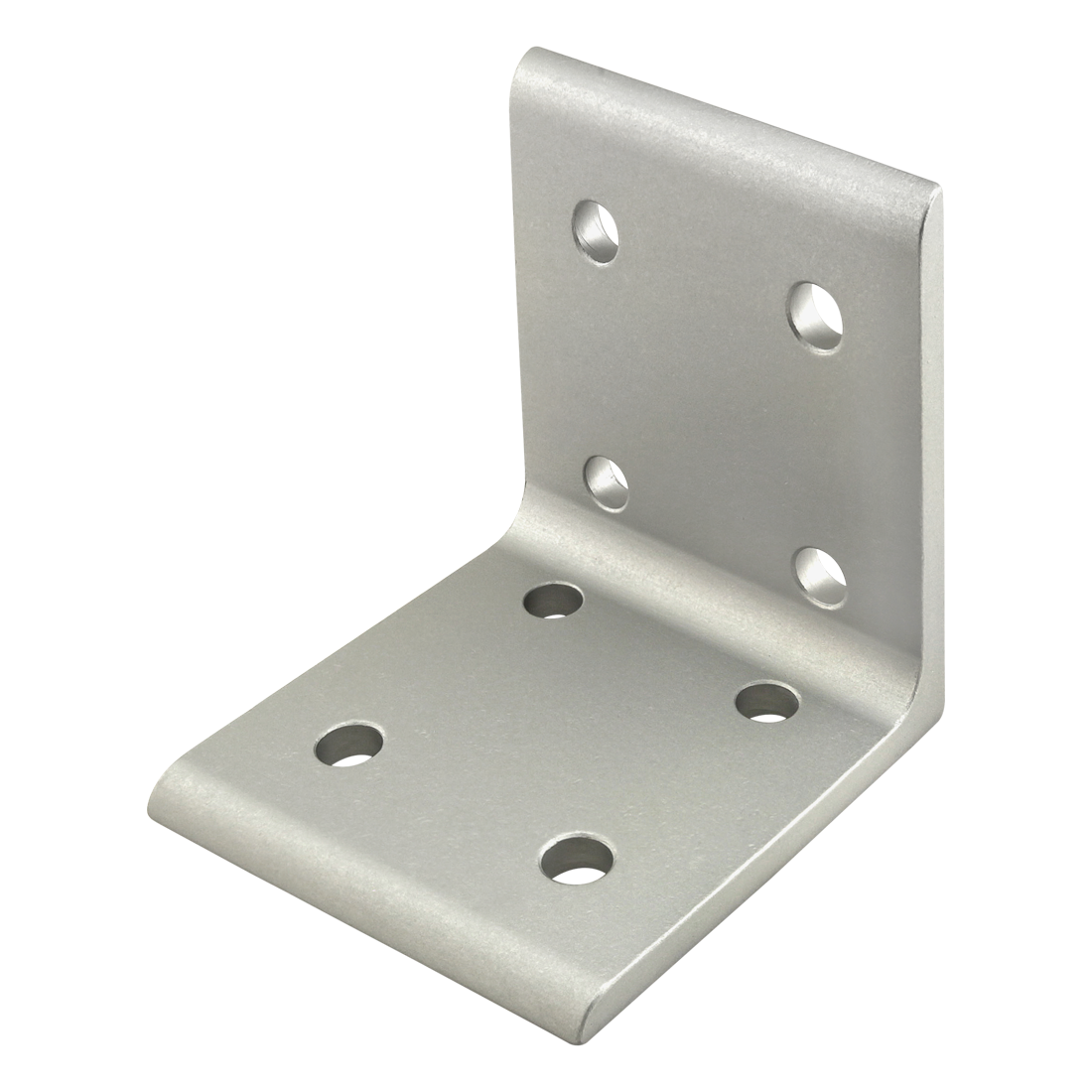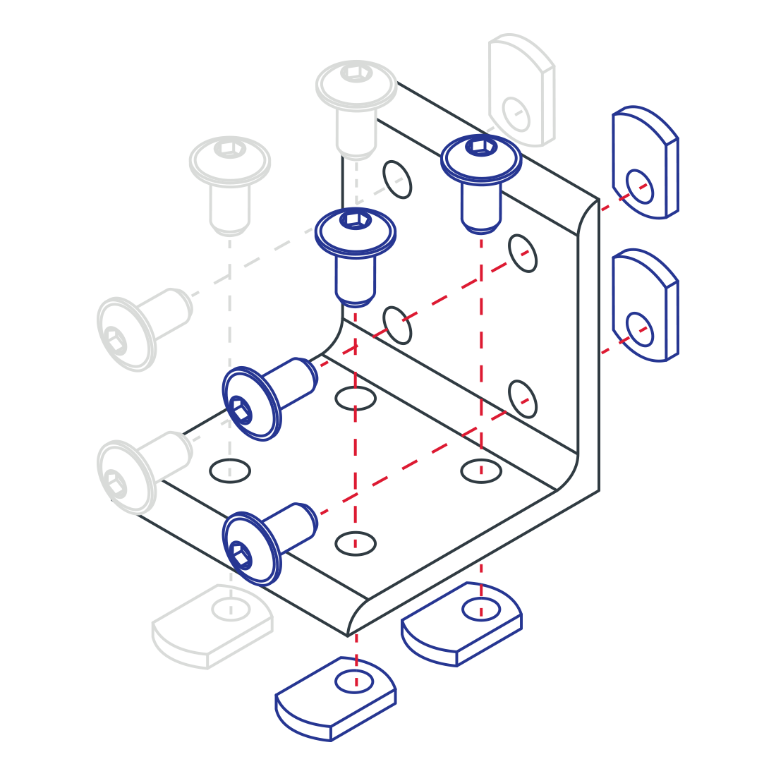 The 8 hole – inside corner bracket is an external fastening method that creates a 90 degree connection and has four holes on each side of the bracket, comprised of two rows and two columns. It requires no machining services and can provide infinite positioning along the profile T-slot, allowing a large degree of adjustability. The 8 hole – inside corner bracket engages the 2-degree drop-lock feature when the assembly bolts are tightened to the required torque. It is a fastening method that can be repositioned and reused. The suggested mounting hardware can be found on the “Suggested Hardware” tab.