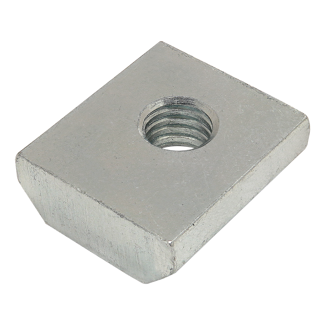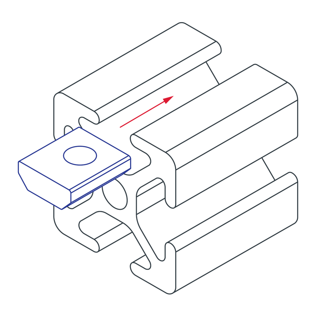 The standard slide-in T-nut is a fastening option that loads from the profile ends. It is a strong, durable connection that is available with options in size, thread, and finish.