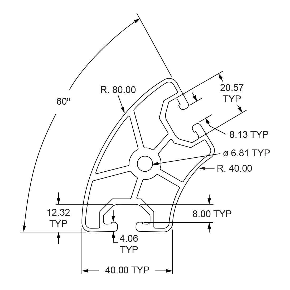 40mm T-slotted Profile 60° Outside Radius – Two Opposite Open T-Slots