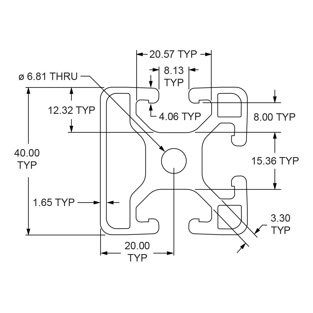 40-4003 is a 40mm x 40mm metric 40 series square T-slot profile with three adjacent open T-slots, one on three 40mm faces. The profile is smooth, which makes it resistant to dirt and debris buildup while also being easy to clean. The 40-4003 profile is compatible with 40 series fasteners. The three closed faces on this profile provide a clean, aesthetic look while also having the capability to mount additional profiles, parts and accessories. It lends itself to furniture, displays, desks, trade show booths, or retail kiosks.