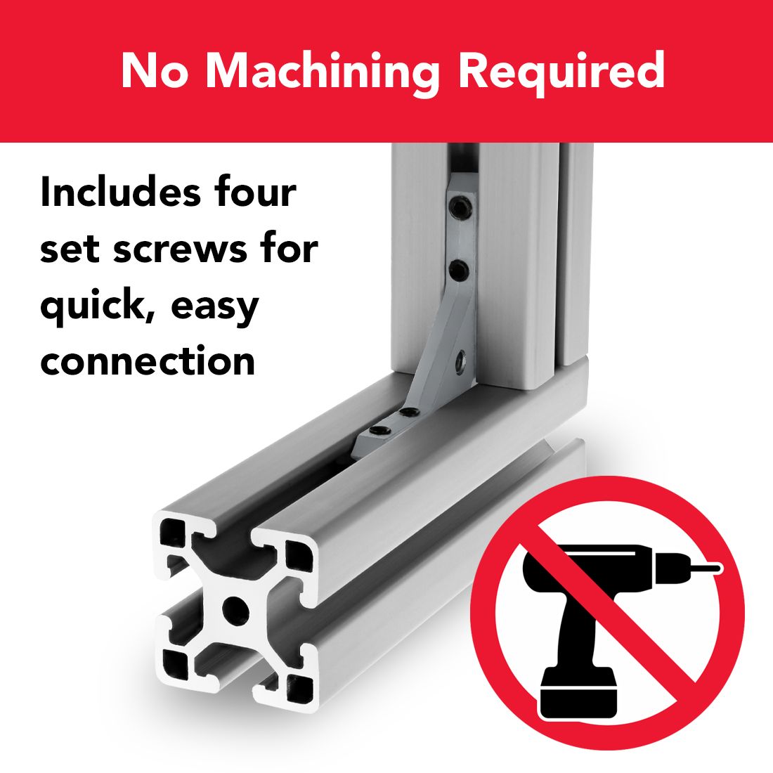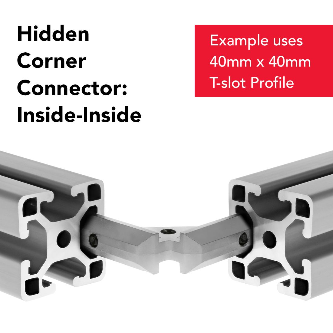 The 90 degree inside corner connector is a strong method for creating 90 degree connections between profiles. There are options available in aluminum or zinc. The required hardware is included with the connectors and no machining services are required, making it a cost-effective fastening method. The zinc connector has a through-hole for panel mounting.