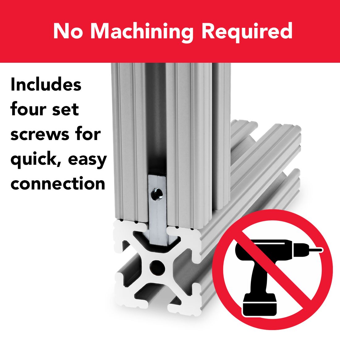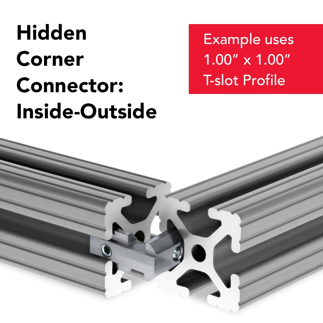 The hidden corner connector provides a 90 degree hidden corner connection. The corner connector comes with set screws that allow for quick, easy connections. This connection can be between the inside of two profiles or between the inside of one profile and the outside of the second profile. The hidden corner connector does not require any machining, making it a cost-effective fastening option. The suggested tool to tighten the included hardware is a 3mm hex wrench.