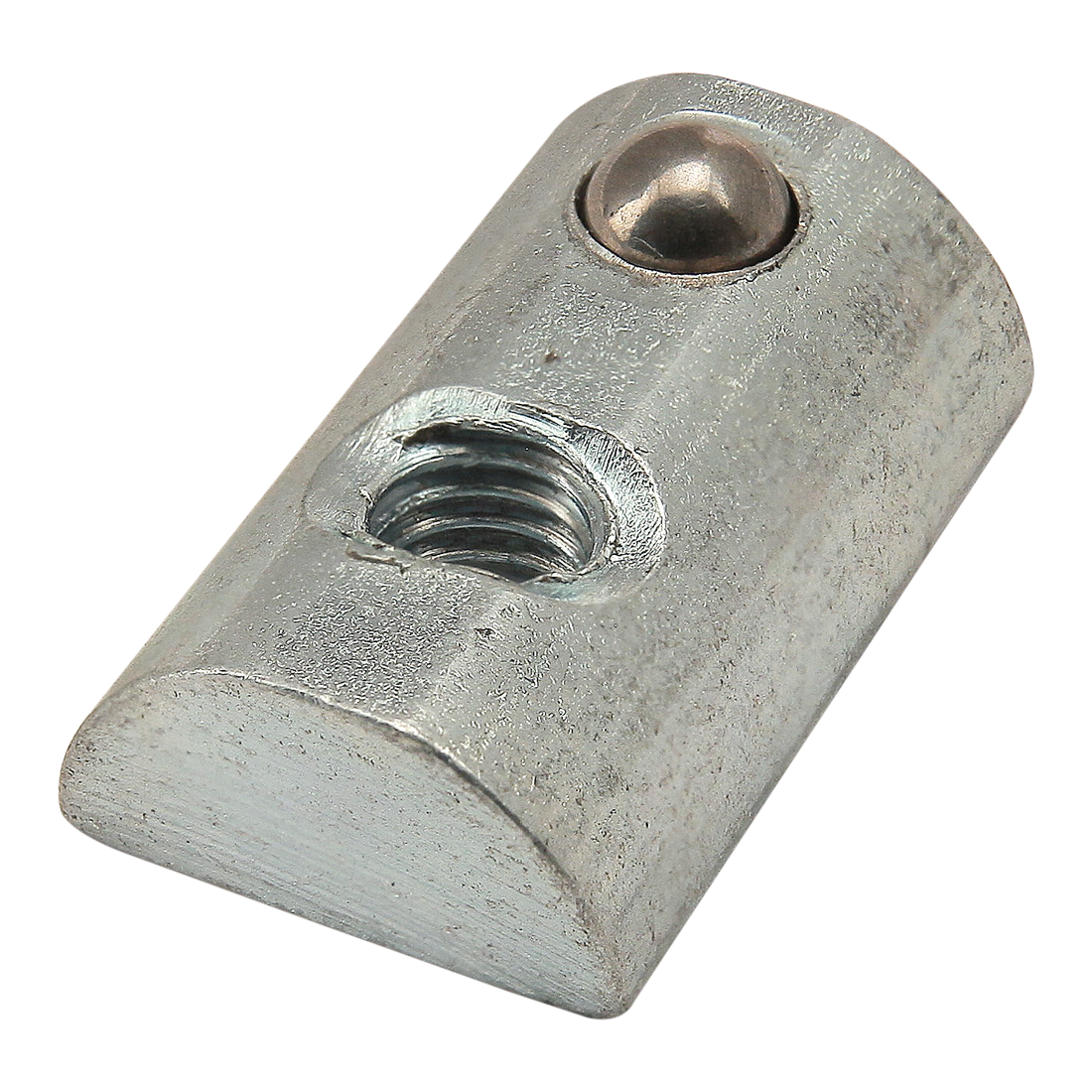 The roll-in T-nut with ball spring is a fastening option that loads from the profile ends or side, which is helpful for applications where the ends are inaccessible. The ball spring holds the T-nut in the T-slot, even when the profile is in a vertical position, simplifying the assembly process. It is available with options in size, material, thread, and finish.