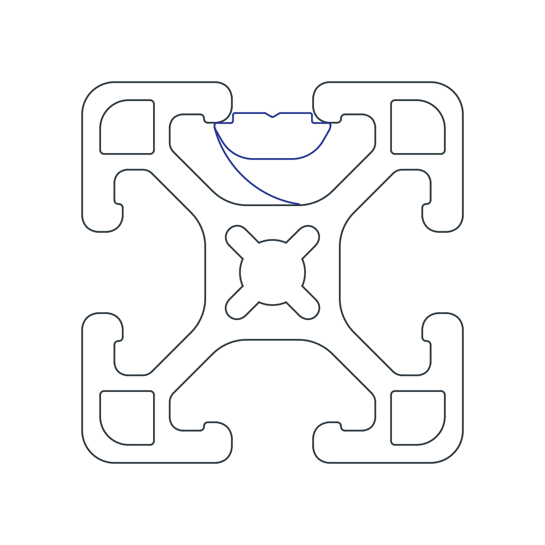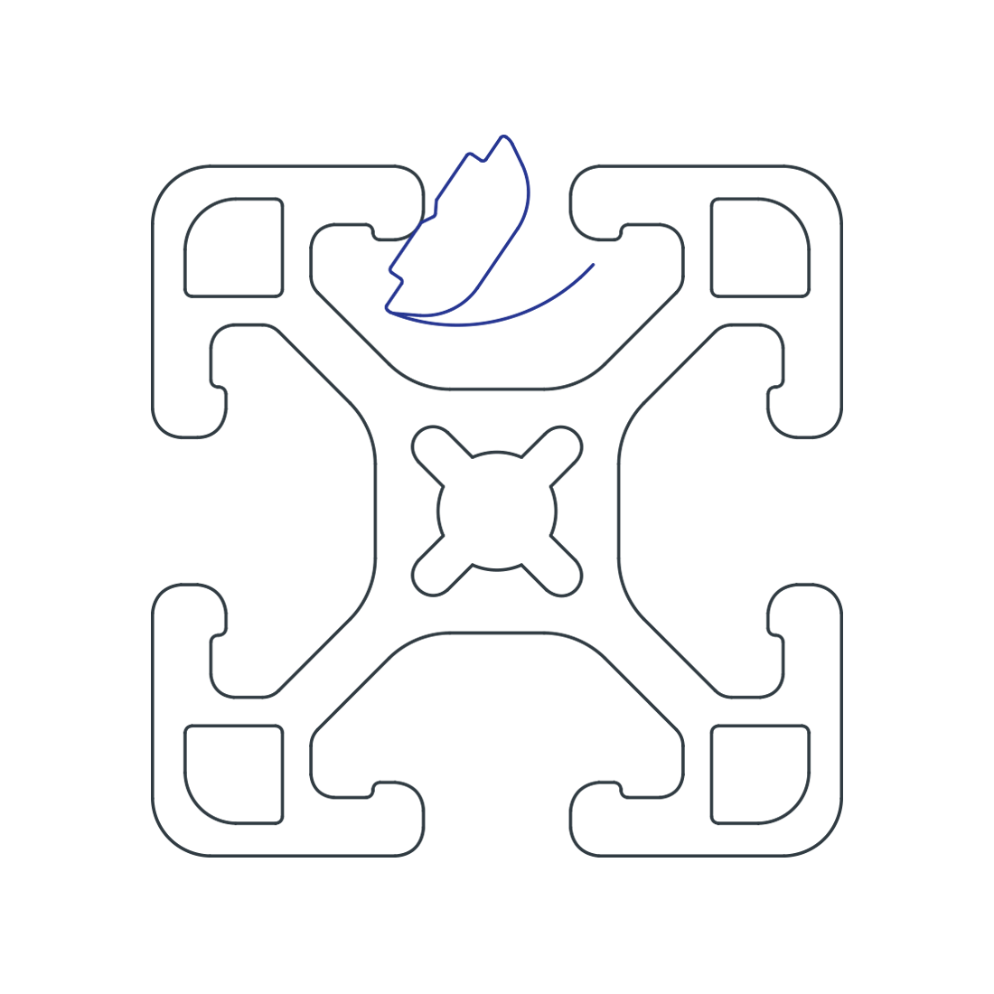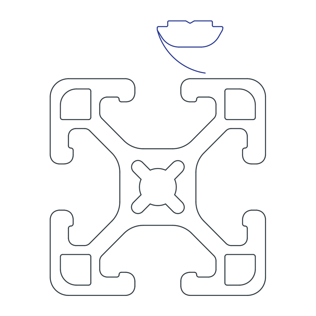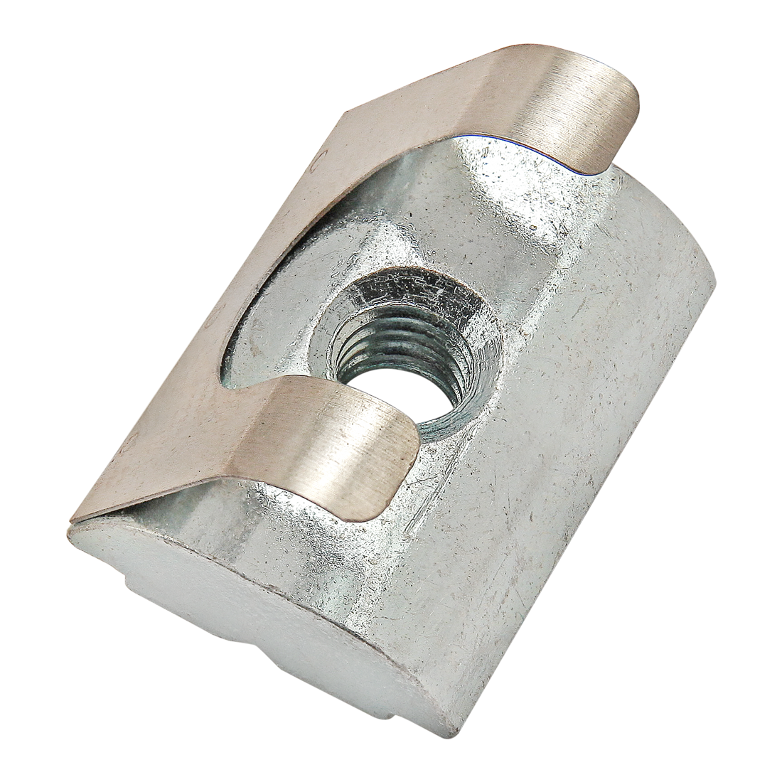 The short self-aligning roll-in T-nut with spring leaf is a fastening option that loads either from the profile ends or side, which is helpful in applications where the ends are inaccessible. The projection on the T-nut aligns it in the T-slot while the spring leaf holds the fastener in place, even when the profile is in a vertical position. It is available with options in size and thread.