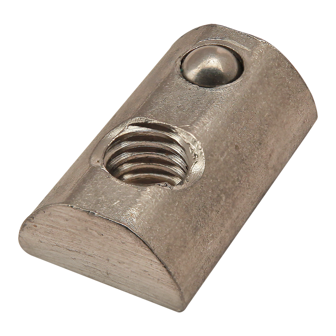 The roll-in T-nut with ball spring is a fastening option that loads from the profile ends or side, which is helpful for applications where the ends are inaccessible. The ball spring holds the T-nut in the T-slot, even when the profile is in a vertical position, simplifying the assembly process. It is available with options in size, material, thread, and finish.