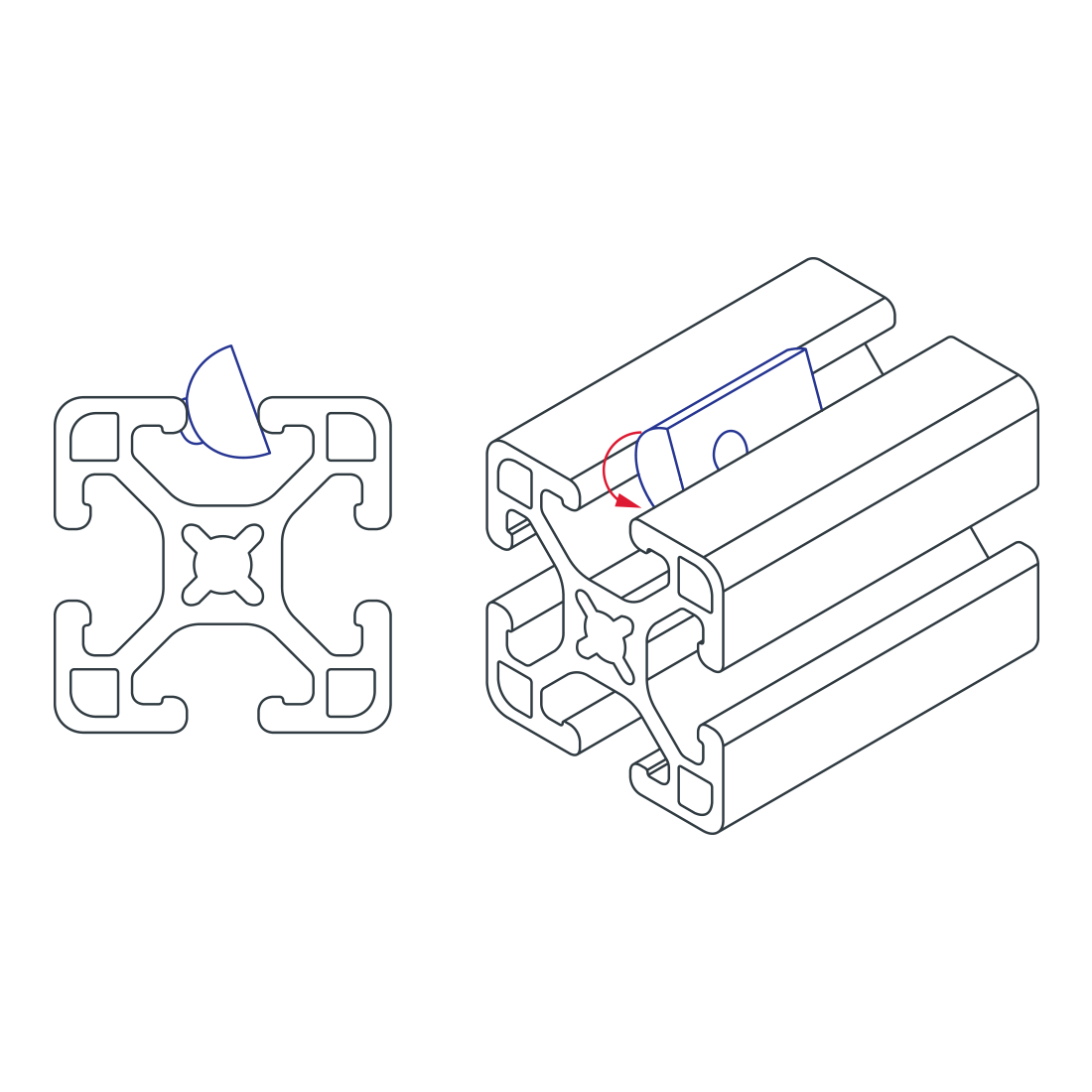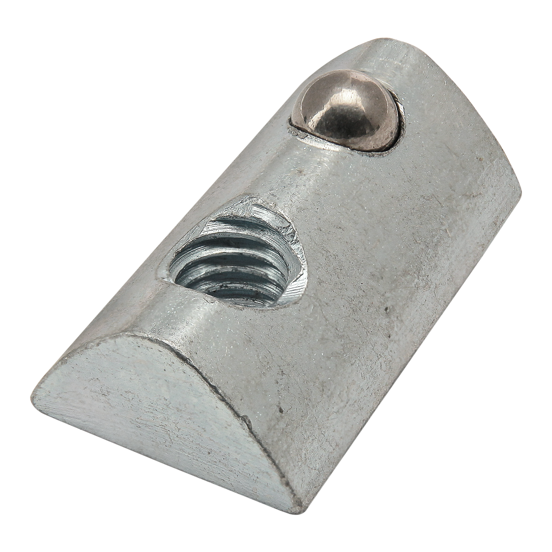 The roll-in T-nut with ball spring is a fastening option that loads from the profile ends or side, which is helpful for applications where the ends are inaccessible. The ball spring holds the T-nut in the T-slot, even when the profile is in a vertical position, simplifying the assembly process. It is available with options in size, material, thread, and finish.