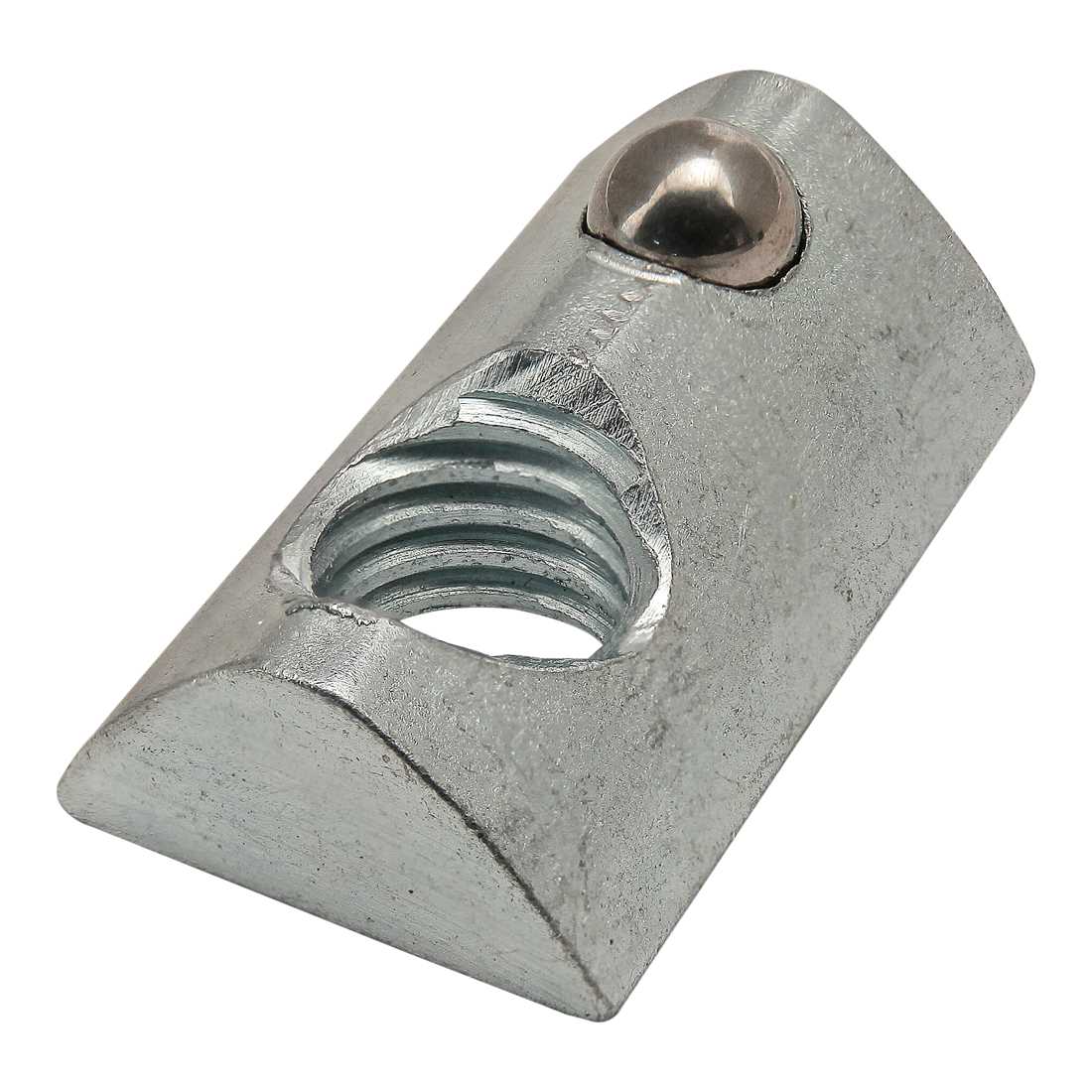 The roll-in T-nut with ball spring is a fastening option that loads from the profile ends or side, which is helpful for applications where the ends are inaccessible. The ball spring holds the T-nut in the T-slot, even when the profile is in a vertical position, simplifying the assembly process. It is available with options in size, material, thread, and finish.