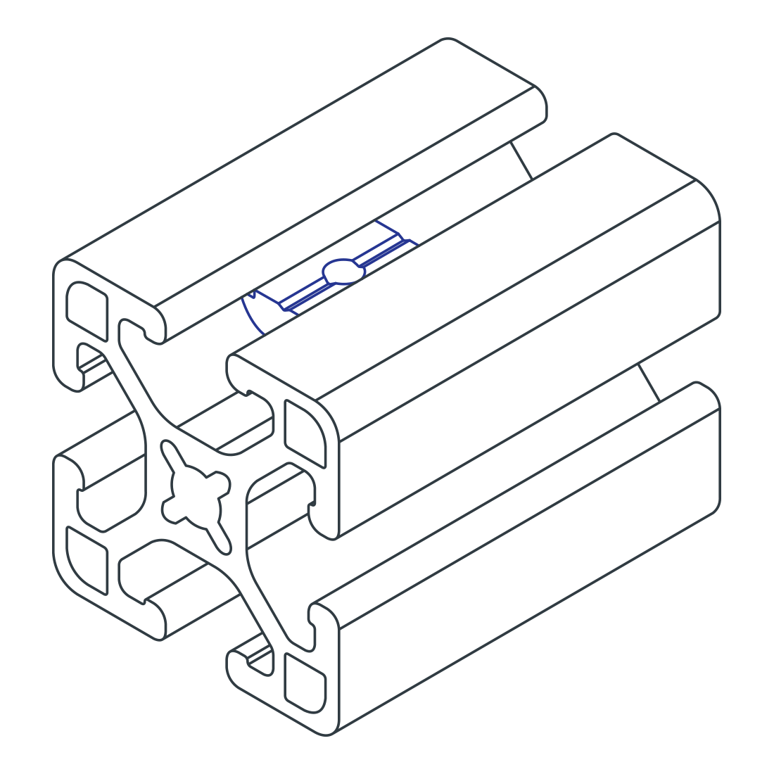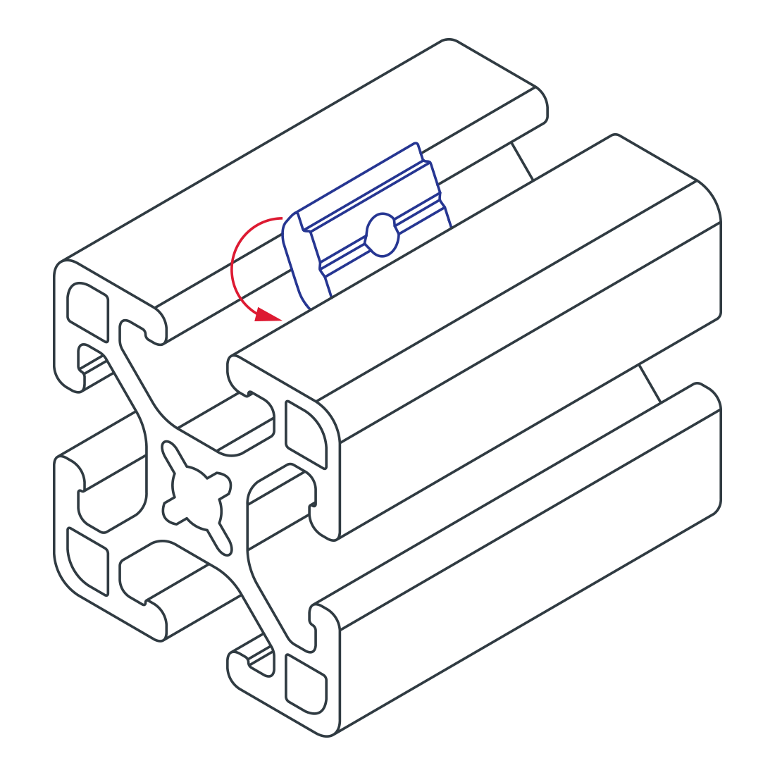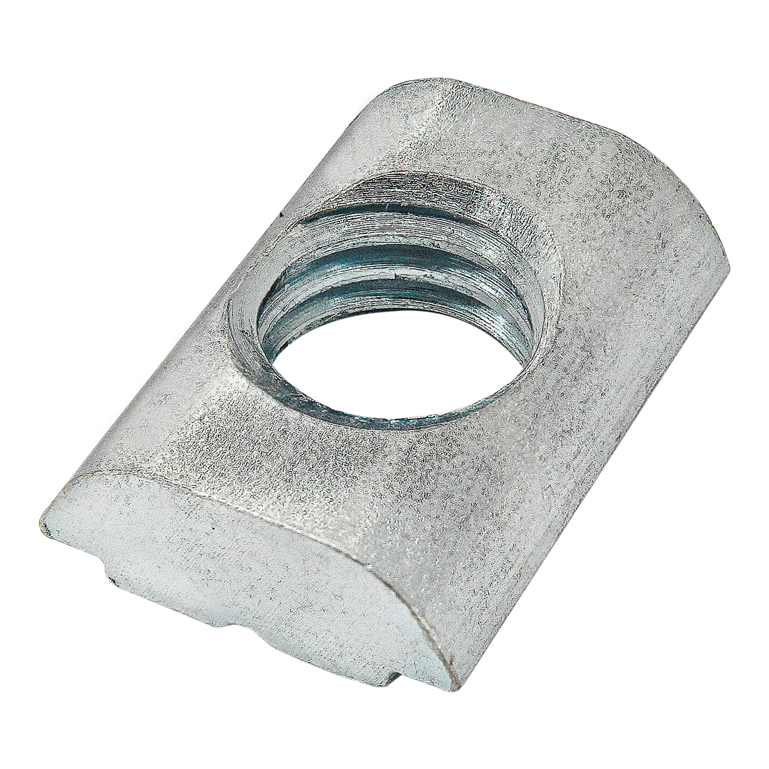 The self-aligning roll-in T-nut is a fastening option that loads either from the profile ends or side, which is helpful for applications where the ends are inaccessible. The projection on the T-nut aligns it in the T-slot for easy assembly. This fastening option provides infinite positioning along the T-slot and is available with options in size and thread.