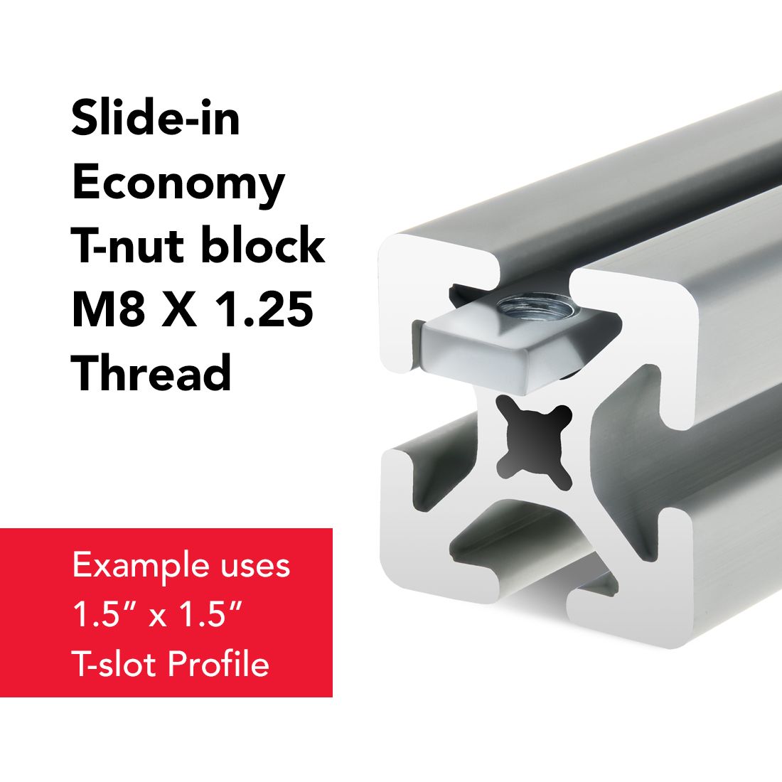 The slide-in economy T-nut block is a fastening option that loads from the profile ends. It is the most cost-effective slide-in T-nut and also provides infinite positioning along the profile T-slot. This fastener is available in a variety of sizes and threads.